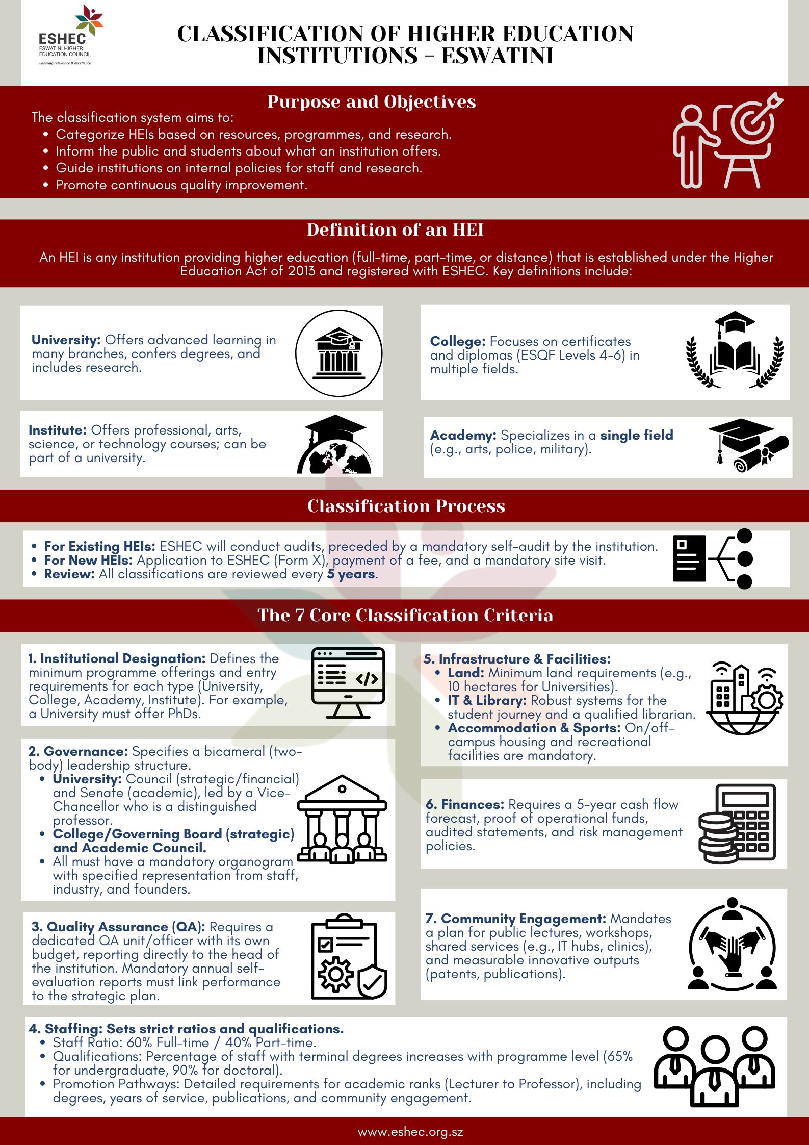 The Eswatini Higher Education Council (ESHEC) was established in 2015 in terms of the Higher Education Act, 2013. It has the overall responsibility of regulating higher education in Eswatini, ensuring that the post-secondary sub-system creates high level knowledge workers necessary for stimulating the economy.
